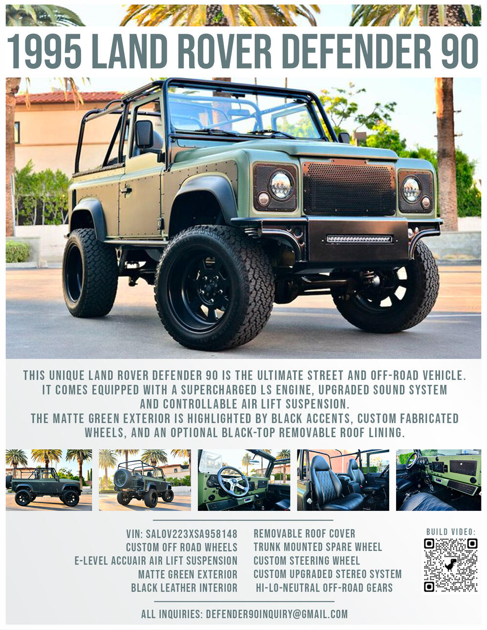 THIS UNIQUE LAND ROVER DEFENDER 90 IS THE ULTIMATE STREET AND OFF-ROAD VEHICLE.IT COMES EQUIPPED WITH A SUPERCHARGED LS ENGINE, UPGRADED SOUND SYSTEM AND CONTROLLABLE AIR LIFT SUSPENSION.THE MATTE GREEN EXTERIOR IS HIGHLIGHTED BY BLACK ACCENTS, CUSTOM FABRICATED WHEELS, AND AN OPTIONAL BLACK-TOP REMOVABLE ROOF LINING.
